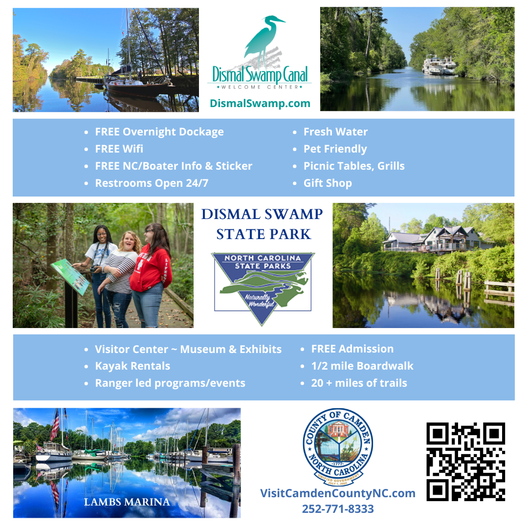 ​The Dismal Swamp State Park and miles of waterfront along the historic Dismal Swamp Canal, Pasquotank and North Rivers, and the Albemarle Sound qualify Camden as a prime eco-tourism destination. The Albemarle Sound is the largest freshwater sound in North America and a popular place for recreational fishing, paddling and boating. The Dismal Swamp Canal is also a part of the Intracoastal Waterway, connecting the Chesapeake Bay in Virginia to the Albemarle Sound in North Carolina. The Dismal Swamp State Park offers visitors a variety of recreational activities including paddling and fishing. The Dismal Swamp Canal Welcome Center is home to a 150′ face dock that provides a rest stop to nearly 2,000 boaters yearly.​​​​